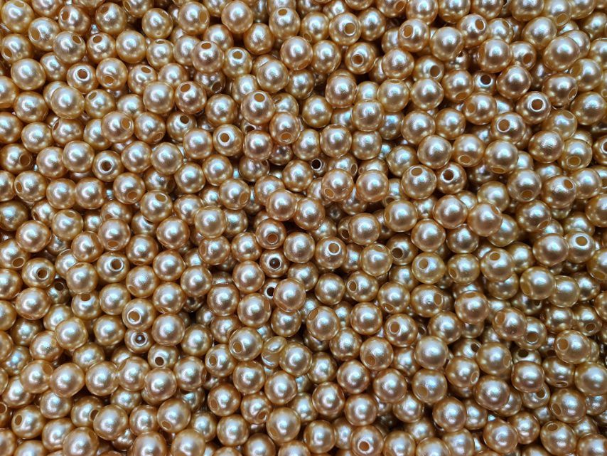 Pérola inteira com furo, material ABS, cor dourada, tamanho 06mm, pacote com 50 gramas.
